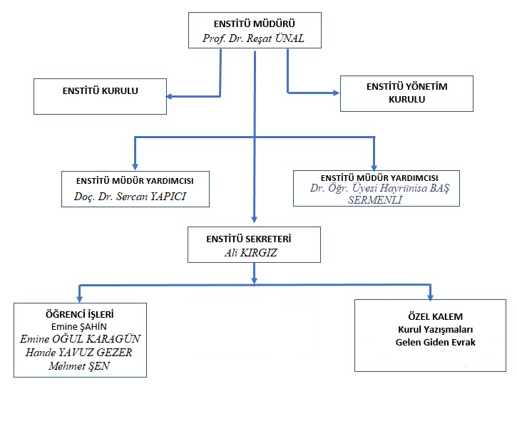Yönetim ENSTİTÜ YÖNETİMİ Prof. Dr. Reşat ÜNAL Enstitü Müdürü ENSTİTÜ KURULU Listesi için Tıklayınız. ENSTİTÜ YÖNETİM KURULU Listesi için Tıklayınız. Doç. Dr. Sercan YAPICI Enstitü Müdür Yardımcısı Dr. Öğr. Üyesi Hayrünisa BAŞ SERMENLİ Enstitü Müdür Yardımcısı Ali KIRGIZ Enstitü Sekreteri ORGANİZASYON ŞEMASI